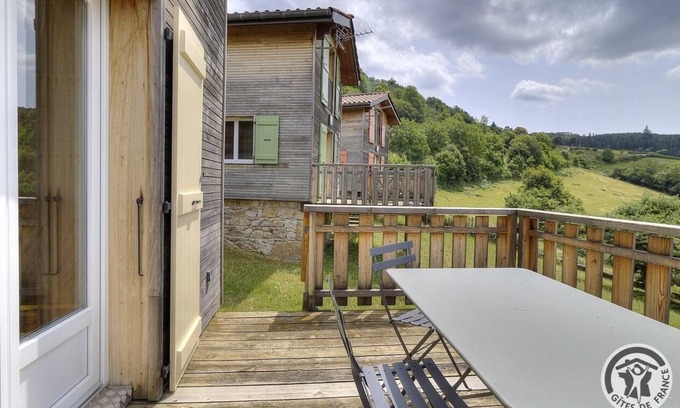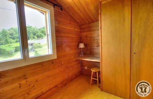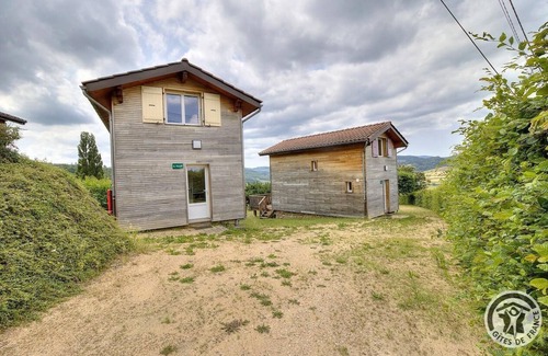 Block of 4 chalets in a peaceful, leafy spot with lovely views of the hilly countryside. Unspoilt setting far from the city bustle, ideal for having a restful holiday. Nearby : hiking & mountain biking trails (the village is crossed by the track 'Compostelle-Cluny-Le puy en Velay'), leisure area (play area for children, boules area, table tennis), inn (takeaway food). Detached wooden chalet set in a meadow including 4 identical buildings. Accessed via terrace (wooden stairs) or practically single level access (1 step) via kitchen on the other side. Ground floor : living room (double sofa bed), kitchen, WC. 1st floor : 2 bedrooms (double bed), (2 single bunks), bathroom. TV point. Bed linen not supplied (no renting possibility too). Large meadow. Parking. Barbecue is not allowed on-site (a fixed one is available in the leisure area). Close to the village hall and a public campsite (6 pitches). Ideal for groups, seminars, courses. Disc golf : 5km. Adventure Park (outdoor activities sports) : 10 km. Zoo : 20 km.