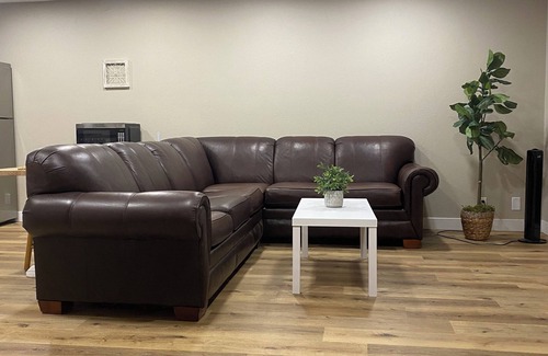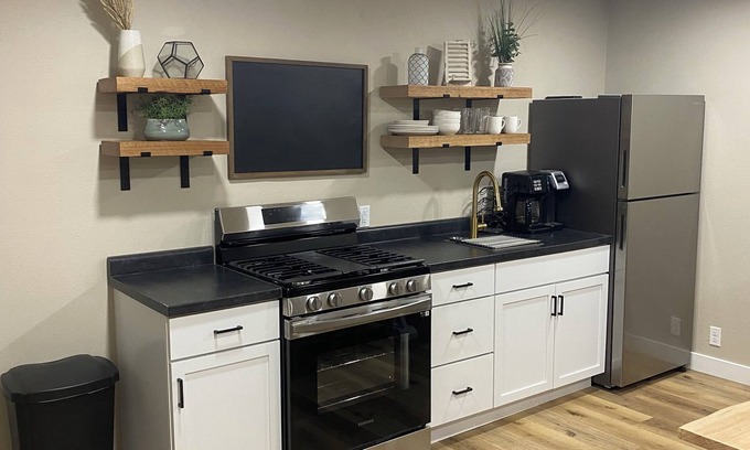 Enjoy a stylish experience at this centrally-located place. This apartment features one bedroom with a queen sized bed and open concept kitchen/ living area. The couch has a queen size hideabed. One bathroom with a walk in shower and full size washer and dryer for your convenience. Entrance and parking access is located in the alleyway behind main street.