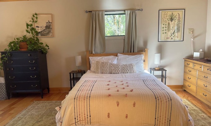 Relax and unwind at this tranquil and private Sierra Foothill cabin in the forest. Landscaped and fenced in back yard with patio with a private view of pristine forest. Cozy, clean and comfortable place to work, relax or enjoy the best of Nevada County's beauty. 15 minutes from historic downtown Nevada city and Grass Valley. 22 minutes from the gorgeous Yuba River 49 crossing. Couch can covert to second bed. Air mattress available upon request. Quiet and traffic free. Wifi, AC & Wood stove.