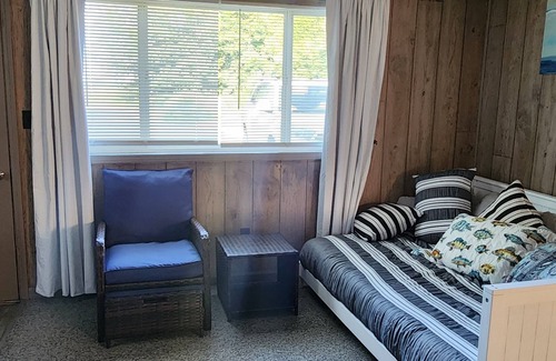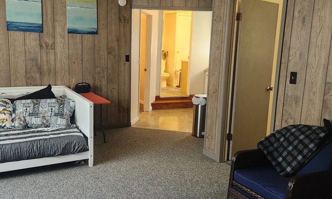 This cottage in Caseville offers a cozy bedroom with a queen bed, a living room with a full day bed and essential amenities like heating, AC, and Wi-Fi, charcoal grill, fire pit and lawn furniture. This home is surrounded by nature on a half acre and just a half mile to town, near beaches and restaurants and marina. Whether you're looking for a peaceful getaway, beach vacation or a romantic escape, this charming cottage is the perfect choice. We'll be available to answer any questions while you stay at our place.