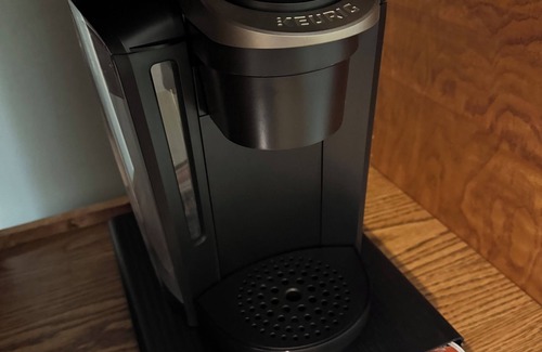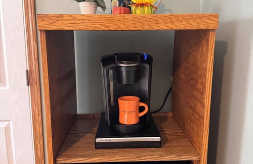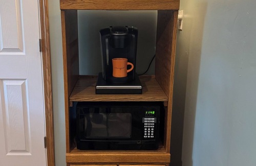Kitchenette with microwave, mini-fridge, hot plate, air fryer, and Keurig with provided pods