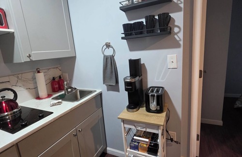 The kitchenette has a bistro table, a refrigerator, a two-burner radiant cooktop, a small microwave, a coffee maker, and a toaster. The cupboards contain dinnerware, glassware, and serving dishes as well as cookware plus cooking and eating utensils. Other stocked items include tea, coffee, salt and pepper, sugar, artificial sweetener, paper towels, and cleaning agents. If you'd like something additional, please ask.