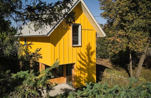 Step into the Sunflower, a bright and thoughtfully designed two-story ADU hidden behind its main house in the charming Como Park neighborhood of St. Paul. Named for its cheerful yellow exterior, the home blends contemporary architectural flair with peaceful garden living. Inside, the ground floor opens onto a private garden, where large sliding doors blur the line between indoor and outdoor space. Expect green kitchen cabinetry, playful “paint‑by‑numbers” shower tile, sleek polished concrete floors with radiant heat, and warm glulam beams framing the upper level. Natural light flows throughout, thanks to skylights and smart window placement designed for both privacy and brightness