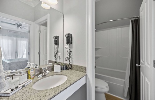 Immerse yourself in the ambiance of our one-bedroom studio villa on the esteemed Carter Plantation golf course. This chic, newly-renovated space is perfect for golfers, wedding guests, and travelers seeking luxury and convenience. The sophisticated décor and serene balcony overlooking the 18th hole creates a cozy retreat.