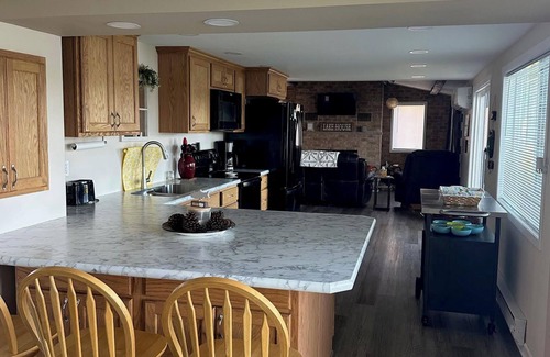 Unwind at this peaceful lakefront retreat in Holcombe. Perfect for families or groups, the home offers comfortable sleeping arrangements with a queen bed, full bed, and two twin beds spread across two cozy bedrooms.