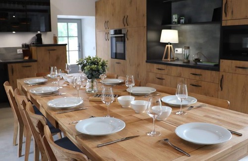 Logis of character from the 18th century, located near a farm and the owner's accommodation, renovated in 2019 and divided into 3 gites, with shared covered swimming pool (7x7m) and relaxation area with deckchairs. The Athos gîte has a capacity of 10 people and can accommodate people with reduced mobility. Ground floor: living room/lounge/kitchen, a toilet, a bedroom accessible to people with reduced mobility (1 180x190 bed) with private shower room. Upstairs, you will have 4 bedrooms (1 180x190 bed) (3 with 6 twin 90 beds), a toilet, two shower rooms. Wireless. Outside, you can enjoy a private terrace with garden furniture, as well as a common ground of approximately 7000m². A common recreation room is available with billiards and darts. Possibility of access to the lingerie with washing machine and dryer. Gas heating included. Bed sheets and towels included.