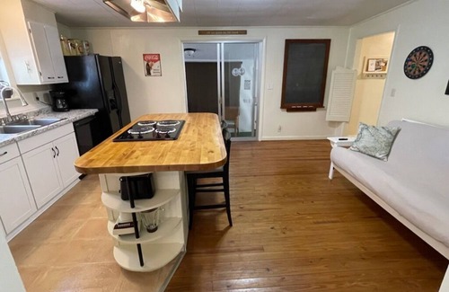Nestled in the heart of historic Welaka, you will feel right at home in this charming house, built in 1930. Within these rustic walls, you will find two bedrooms, one full bath, a family room and breakfast nook with a flat screen television, fully- functioning kitchen, WIFI, and two game rooms. The front porch game room allows for indoor activities such as cards and board games. The back porch offers seating and an air hockey table.