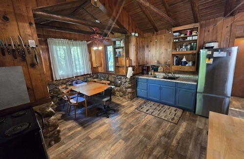 Step back in time with this classic 1940s cabin, thoughtfully updated to retain its rustic charm. Featuring original stone wall fireplace, and a vaulted pine ceiling, this cabin embodies the perfect blend of history and comfort. The spacious bedroom offers two queen beds and a lofted double, ideal for kids. The bathroom includes a walk-in shower.