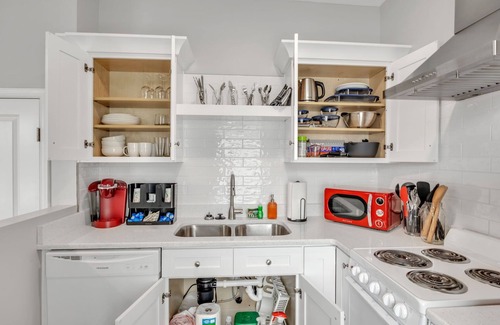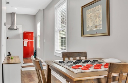 Inside, you’ll find a cozy queen bed with fresh linens, a cozy sitting area, and a Smart TV ready for your favorite streaming apps (using your own logins, no cable). The fully-equipped kitchen—complete with sleek white cabinetry, modern appliances, and a bold red retro fridge—adds a fun pop of personality while giving you everything you need to cook at home. Enjoy meals in the intimate dining nook or set up with a laptop for remote work.