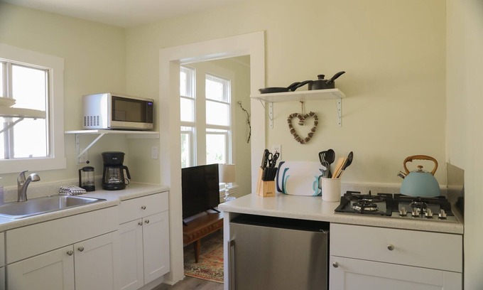 The kitchen is well equipped if you are wanting to make a meal. There is a mini-refrigerator (no freezer) and a cooktop with burners, but no oven. There are fantastic restaurants in the area and a great grocery store all within walking distance.
