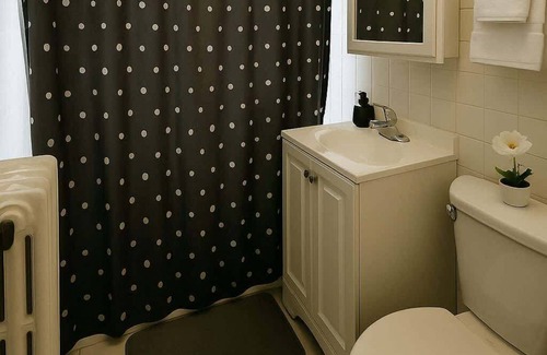 The bathroom is clean and bright, stocked with fluffy towels, shampoo, body wash, and a hairdryer for your convenience.
