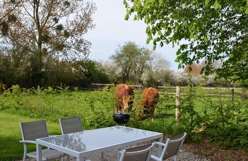 House adjoining another rental. On the ground floor: Living room (TV, Internet via Starlink). Kitchenette (microwave, espresso machine, gas hob, dishwasher, freezer compartment). WC. Upstairs: Bedroom 1 (160cm bed). Bedroom 2 (2 90x190cm beds). Shower room with WC (shower, towel dryer). Washing machine. Electric heating included. All charges included. Sheets and towels provided. Cleaning optional. Baby equipment on request. Private unfenced garden. Garden furniture. Barbecue. Covered shelter. Pond on site. Shared swing and slide. Ping-pong table and table football in the courtyard of the estate. Rental of bikes (muscular and electric) and horse boxes possible. Restaurant and relaxation area (sauna, relaxing shower and massages by reservation) present within the estate (closed from 15/11 to 31/03). Two electric vehicle charging stations are available (charges are charged on site). The cottage is an integral part of the Utah Beach Estate, a 178-hectare estate in the heart of the countryside offering a variety of services.