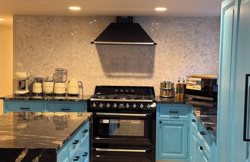 The fully equipped kitchen is a chef’s dream, featuring a Smeg 36-inch range, Bosch ultra-quiet dishwasher, freestanding Sub-Zero refrigerator and freezer, and a stunning waterfall island, perfect for meal prep or casual dining. Charming Smeg cream pastel small appliances complete the stylish and functional setup, including a Smeg espresso maker, milk frother, citrus juicer, blender, kettle, coffee maker, countertop microwave, and a Crock-Pot—everything you need for a perfect morning or relaxing meal.