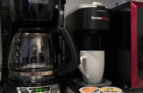 Guests can enjoy a wide variety of Starbucks coffee and teas, including Chemex, French press, k-cup, and traditional drip options. The apartment also features A/C with remote control, (portable fans and heaters upon request), a hair dryer, iron and Charmin toilet paper for added comfort.