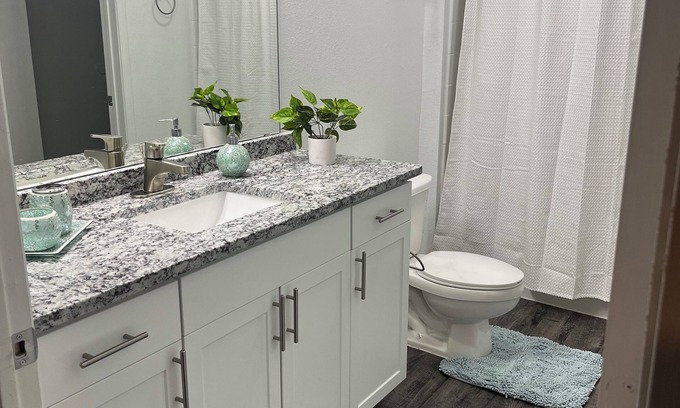 Modern luxury 2-bed 2-bath apartment in Plano, Texas! Perfectly blending comfort with convenience, this residence offers a vibrant living experience steps away from Legacy East, enjoy nearby attractions like Stonebriar Centre Mall and the shops of Legacy. With amenities such as free parking, smart TVs, and a fully equipped kitchen, plus memory foam King and full size beds it's ideal for relaxation and fun. Enjoy luxury amenities such as granite countertops, kitchen bar and stainless steel appliances, ensuring everyday comfort from morning to night.