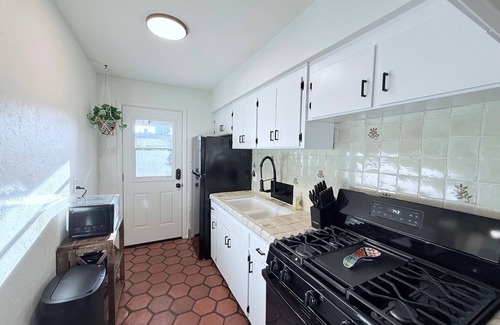 The full kitchen is stocked with everything you need for a night in, featuring vintage tile countertops, a gas stove, and a back door that opens directly to the backyard retreat. Both bedrooms are designed for rest and relaxation with queen beds, Saltillo tile floors, ceiling fans, and large windows with room-darkening shades for a peaceful night’s sleep.