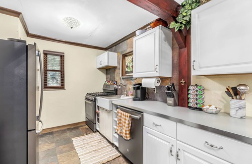 Much of the original 1920's charm has been preserved here with coved ceilings, beautiful wood trim and ornate plaster work. Many have said it feels like staying at an 18th-century European cottage! The property has some quirky, unusual nooks and spaces. The wood floors have a slight creak. The HVAC system was retro fit to the home to replace a coal-burning stove. There is an old coal room in the basement. There are endless things to look at in the home as I have searched far and wide to find period-specific pieces, decor, and fixtures. It is different from staying at a hotel but those who appreciate those touches adore the space and the unique Tudor architecture