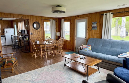 The Island View cabin is located on a 68-foot lakefront lot on the south shore of Shawano Lake. You have a beautiful view of the lake from the living room and dining area. The lake in front of the cottage is shallow with a sandy bottom - perfect for young swimmers. There is a bonfire pit on the lake side. Additional amenities include a washer and dryer, full kitchen, Blackstone grill and free firewood for the fire pit. The home has one bathroom, central air, cable TV and free WiFi.
