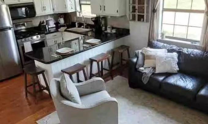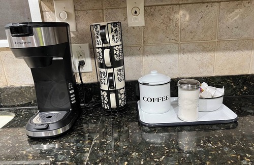 Kitchen has quality cookware and basic spices to cook at your home away from home. Coffee pods and creamer provided for guests.
