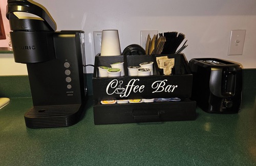 Enjoy the convenience of a full kitchen, including a coffee bar w/Keurig (variety of pods provided), air fryer, toaster oven dishwasher, and garbage disposal. The open floor plan on the first floor includes a dining room with hard wood floors and table with seating for 6 (table extensions provided upon request). The large living room includes a hardwood floors, a large stone fireplace, 50" tv, couch, recliners and a beautiful view of the surrounding property. A large wooden deck is accessible from the living room and is the perfect spot to sit and enjoy the scenery.