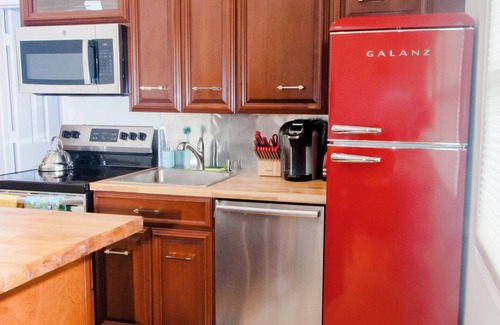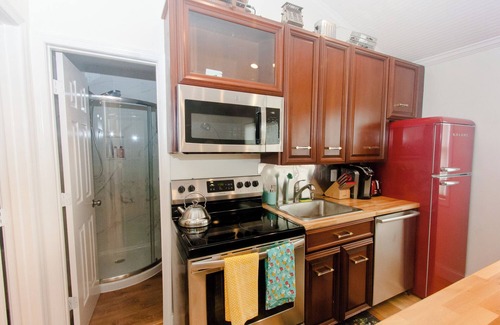 This marvelous property is perfect for a peaceful getaway. Enjoy the convenience of amenities like a full kitchen with full sized range/oven and microwave, a refrigerator / freezer, Keurig style coffee maker with reuseable stainless-steel cups, coffee beans and grinder, and all the cooking utensils you need as well as silverware, plates, bowls, glasses, mugs. If you love BBQ we have a gas grill right outside the front door for guest use. Lightning-Fast Broadband WiFi, Central Heat / AC, an in unit full-sized Washer / Dryer, an iron and ironing board, and convenient reserved guest parking right next to the cottage door. It also has a patio area with picnic table and small firepit or feel free to use the large fire pit area down by the pond.