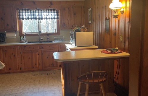 The largest room is the great room, great for visiting with friends and family. Fully lined with knotty pine for the complete rustic vibe. It's hard to tell from the pictures, but it's approximately 15x25'. Although the massive stone fireplace is not to be used due to fire concerns, it is a wonderful spotlight in the home. From the picture windows in the great room, depending on the season you can watch birds, enjoy the sound of rain, watch snow drifting down on the trees. I have spent many hours sitting at the dining room table, working and just looking out the window. I find it a very peaceful place, and I hope you do as well.