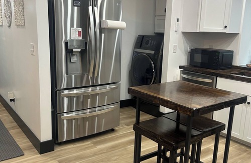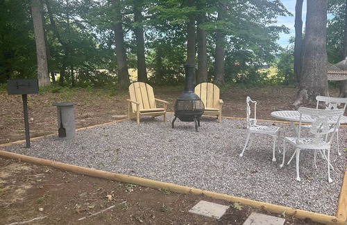 Outside the amenities continue. The private back patio features a full outdoor dining set, and a four person hot tub with a UV sanitation system, Bluetooth audio, and LED color-changing lights. Stretch out in the hammock, enjoy a game of horseshoes, grill out on the charcoal park-style grill,(bring your own charcoal) gather around the chimney style fire pit, (firewood is included) or sip your coffee on the front porch swing or bistro set.