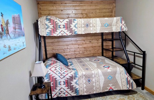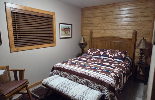 Inside, you’ll find warm wood finishes, comfy leather seating, and plenty of Southwestern touches that make the space feel inviting and unique. Kick back in the living room, enjoy meals together around the dining table, or get a good night’s sleep in one of the two cozy bedrooms.