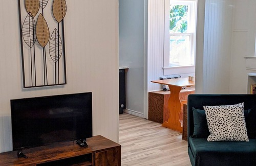 Cute little 2 bedroom 1 bathroom home. Larger bedroom has a Queen bed, smaller bedroom with two twin beds. Simple living room with futon and chair-bed can sleep another two. Furnished kitchen with built-in dining nook. There is a yard on the side of the home through which there is access to the laundry which is shared with the 1 bedroom house next door.