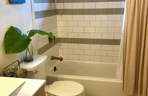 The first bedrooms feature a queen bed and the second bedroom has a full bed, ensuring a comfortable night's sleep. The bathroom is equipped with a bathtub, with shower and toiletries. A hair dryer for added convenience. In the additional living room space, there is a twin bed for extra sleeping arrangements.