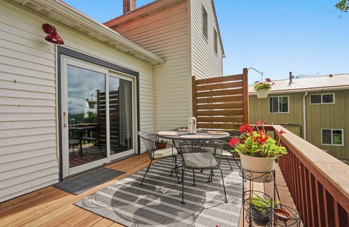 As your Viroqua home away from home our East South Street offers proximity to downtown, and also spacious privacy. Our 9 ft ceilings, wood floors, and windows make this home feel light and open. This house is recently lovingly redone and filled with our art and textile collection. Spend time out on the large back deck overlooking the flowers, yard, farm field and cemetery beyond. We know you will love our East South Street place as your home base.
