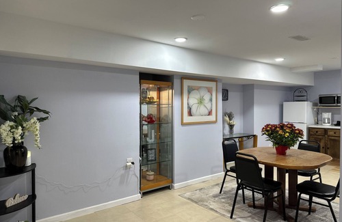 Cozy 2-bedroom basement suite with 2 full-size beds, living room, TV with Netflix, and free internet. Kitchen includes a fridge and coffee maker (no oven). Smoke-free and pet-free for a clean, comfortable stay. Located just minutes from downtown Saint Charles, Fox River trails, shopping at Geneva Commons, and more. Enjoy the peaceful setting with easy access to local attractions. Perfect for families or work retreats!