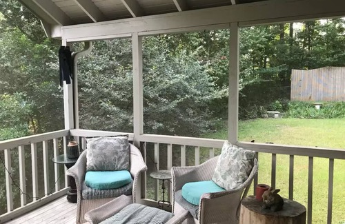 Escape to this enchanting 2-bedroom Tallahassee retreat. This cool house features 1 queen bed and 1 full bed, perfect for a cozy stay. Relax in the bathtub after a day of exploring. Have a coffee or cocktail on the screened porch overlooking a beautiful wooded view. Make yourself at home in this quaint hideaway - your perfect home base for a memorable getaway. Feel free to reach out to us during your stay - we're happy to suggest local spots to check out.