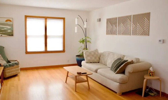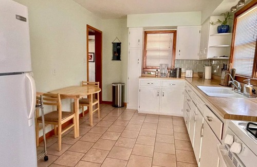 This clean and cozy single-story house is nestled in a quiet neighborhood, just a 12 minute walk from the local bakery. It has 1 bedroom with a queen and 1 with two twins, 1 full bath, a living room and a well equipped kitchen. There is a large yard that can be enjoyed while dining on the back deck. The unfinished basement has a washer and dryer and an additional working toilet & sink. The driveway can fit 2 cars.