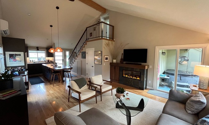 This modern townhome in Ashland offers 2 cozy bedrooms with a queen and full bed, perfect for a peaceful night's sleep. With 2 bathrooms equipped with a hair dryer and bidet, guests can freshen up before exploring the city. Enjoy the hot tub and fireplace as well as the fitness/TV room and stay connected with WiFi. The charming property also features a washing machine and dryer, and new kitchen appliances for convenience. We think our place will help you experience everything Ashland has to offer.