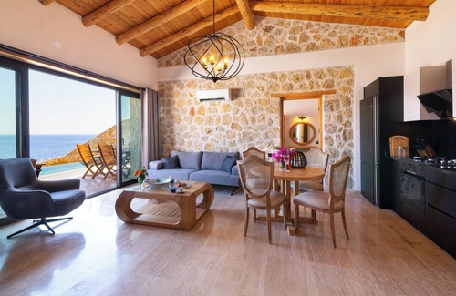 Step outside and be astounded by the striking views of the glittering waters of Kalamar bay and Snake and Mouse Islands beyond. Relax with a cool drink in hand on one of the comfortable sun loungers around the infinity pool, or maybe take your book down to the bathing platform and unwind by the lapping water's edge, taking a dip in the sea when the sun is at its peak. The beach club style bathing platform is accessed by steps, and then a gently sloping pathway, and is just moments away from the main property.