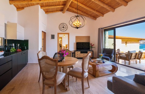 The Villa is an impressive choice for a stay in Kalkan, offering luxurious accommodation for up to 4 guests in the sought after Kalamar Bay area. This 2 bedroom property enjoys an elevated position affording great views across the Turquoise Coast and features an infinity pool, an outdoor dining and lounge area, and a beach club style bathing platform area with direct sea access.