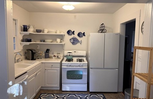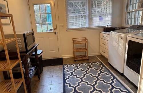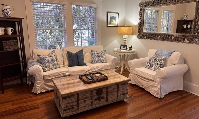 Truly unique and filled with natural light! Beautiful original hardwood floors and luxury hotel bedding (crisp white cotton percale sheets and duvet). Clean and fresh white slipcovered furniture, casually covered with white linen and cotton throws we wash between every guest. Simple and elegant decor featuring original art from the annual Brookhaven Artist's Market. Brand new kitchen appliances in the small but bright and sunny kitchen.
