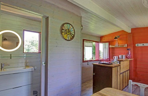 24 m² fully equipped caravan to accommodate 4 people, including a bedroom with a double bed, 2 bunk beds in the living room, a kitchen area, a small bathroom with toilet. You will appreciate its 16 m² terrace where you can enjoy your meals in the summer! By reservation with the owners: gourmet breakfasts which will be brought to you in a basket €5 and meals €12. Thysbee & Hervé warmly welcome you to their Chat qui Pète caravan which is an ideal refuge for a restful and relaxing stay! Entirely built by the owners from the walls to the furniture, you will be seduced by its personalized interior and its intimate character. It is located on a small campsite in a 2 ha property including other accommodation options including a group gite. The natural setting is pleasant and peaceful, and you can relax by the fishing pond (fishing is included in the price) or wander among the small animals on site (donkeys, goats, rabbits, birds, etc.). Easy access, Roanne is 11 km away.