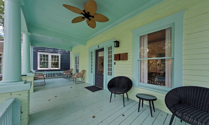 This lower-level unit features 2 bedrooms and 2 full bathrooms, including a clawfoot tub. Enjoy a cozy living room with a decorative fireplace, a dining area, a full kitchen with modern appliances, and a classic Southern front porch with seating.