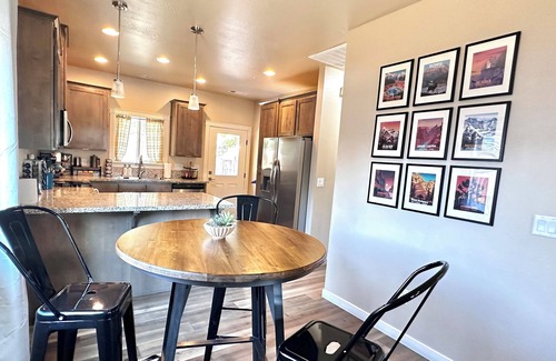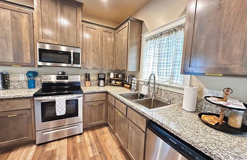 The full kitchen comes fully equipped with everything you need to cook a meal at home — from cookware and dishes to modern appliances — and opens into a cozy dining area, make it easy to enjoy meals together or catch up on work.