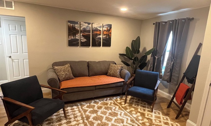 Backyard access, WiFi & driveway parking. House includes one queen-size bed, one full-size bed, and a queen-size sofa bed. Whether you're here for work or leisure, you'll find everything you need for a comfortable stay. Come & experience this welcoming retreat.