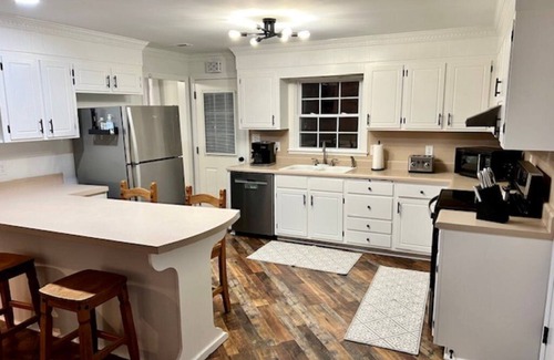 Enjoy a stylish experience at this centrally located place. This newly "spiffied up" house has all you need. One floor living. Three bedrooms; a master suite with a king bed, second bedroom with a queen bed and third bedroom with a full bed. Second full bathroom. Living room with 65" Smart TV. Den with 55" Smart TV. Fully functional kitchen with new appliances. Washer/dryer. Covered screened patio with 60" Smart TV. This place is a hidden gem! We provide local coffee from Rooster's in Floyd.