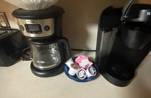 The kitchen is complete with pots & pans, dishes, utensils, blender, rice cooker, toaster, keurig, coffee maker, microwave, cutting boards. There is also vegetable oil, salt, pepper, garlic powder, garlic salt, onion powder, foil & cellophane.