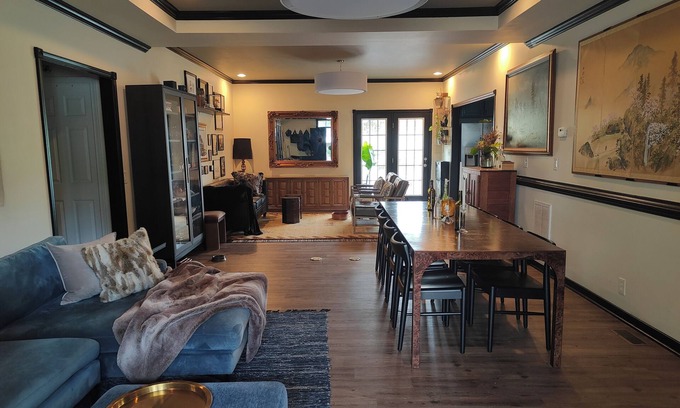 This home boasts modern amenities while retaining its warm charm. The spacious primary bedroom features earthy tones and generous natural light, making it a serene haven for couples getting ready on their big day. An elegant living and dining area invites celebration, complete with a stunning oversized dining table that accommodates large gatherings, perfect for toasting your love. The kitchen, equipped with stainless steel appliances and ample counter space, makes meal preparation seamless, whether for wedding brunch or late-night snacks. Flexible spaces allow you to transform home offices into additional sleeping quarters if needed, ensuring everyone feels comfortable during their stay.