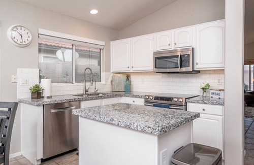 Nestled in the heart of North Peoria,single-story home features 3 bedrooms and 2 full bathrooms. You'll be welcomed by a spacious living & family room, equipped with two large-screen TVs and a cozy fireplace.The home also includes a desk and a laundry room, along with a bright,fully-stocked kitchen.The primary bedroom offers a king-sized bed and a 5-piece en-suite bath.Private pool! This home is conveniently located near shopping, dining, and numerous restaurants, golf, and Peoria Sports Center.