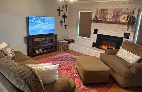 * Cozy living room with a 58” Smart TV, electric fireplace, comfortable furnishings, and ceiling fan