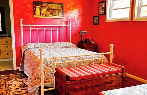 Whether you are honeymooning, re-kindling your love, or having a friendcation, Lucy’s Hilltop Hideaway invites you to indulge in tranquility. Surrounding you is a farm with spectacular views of lush greenery, animals, and two ponds. Inside, rustic elegance meets modern comfort. The kitchen is a cozy culinary haven. Bedrooms offer a restful slumber.