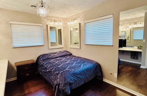Our house comes with 3 bedrooms (1 King, 2 queens) and 1 bathroom with a bathtub. It features a fully furnished kitchen, complete with coffee maker (keurig) and coffee! There are 3 TVs throughout the house, all have Roku!
