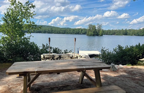 We are located on the tip of a peninsula and surrounded by peaceful Raymond Pond on 3 sides of property with the 4th side completely fenced in so your doggy friends can roam comfortably. The open concept common area includes dining, 2 sitting/living room areas and kitchen. Master bedroom has a full bed, 2nd bedroom has 2 twin beds and 3rd bedroom has 1 twin bed with a full size bed in loft above. Outdoor space is large and accommodating. Spacious deck overlooking water with propane grill. Sandy waterfront with steps down to water entry. Owner provides rowboat, canoe and dock for recreational use; (boat launch is located just before property and open to those residing on island). Enjoy roasting smores over firepit or at the stone fireplace. Whether you are coming to experience all the Sebago Lake Region has to offer or want to cozy up and enjoy full privacy this waterfront property provides, we know you will enjoy your stay!